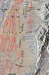 A compilation of drops in topography associated with the fault strands across the Llano de Manzano shows a total of about 100 feet of surface drop to the west in the past 100,000 years.